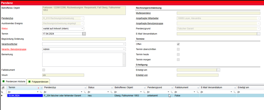 - Pendenz erfassen Wird die Erfassung einer Pendenz aktiviert, muss der Pendenzgrund angegeben werden und die angefragte Benutzergruppe oder der angefragte Mitarbeiter. Sofern zu den markierten Rechnungsrückweisungen jeweils eine Pendenz mit Status 'neu' vorhanden ist, kann anhand des Pendenzgrundes über die Entscheidungstabelle 'Pendenz Aktion' eine Folgependenz für die Rechnungsrückweisungspendenz angelegt werden, die dem Fall zugeordnet wird. Der Status der Rechnungsrückweisungspendenz wird auf 'wartet auf Antwort (intern)' gesetzt, der Status der Rückweisung auf 'in Arbeit'.