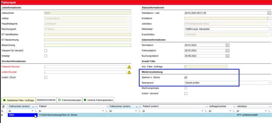 Hinweis: Das Sperren des Falles für die Fakturierung aus einem Storno-Job heraus erfolgt nach der Verbuchung, d.h., wird ein Fall im Storno-Job selektiert, dann aber wieder aus diesem gelöscht, dann wird der Fall auch nicht gesperrt.