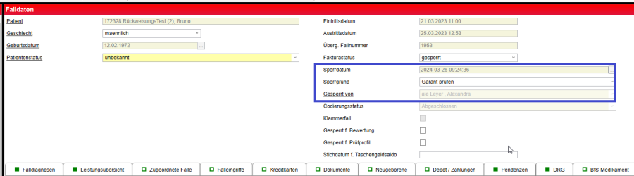 Hier wurden die Felder 'Sperrdatum', 'Sperrgrund' und 'Gesperrt von' ergänzt, die sich auf die Sperre eines Falles für die Fakturierung beziehen.