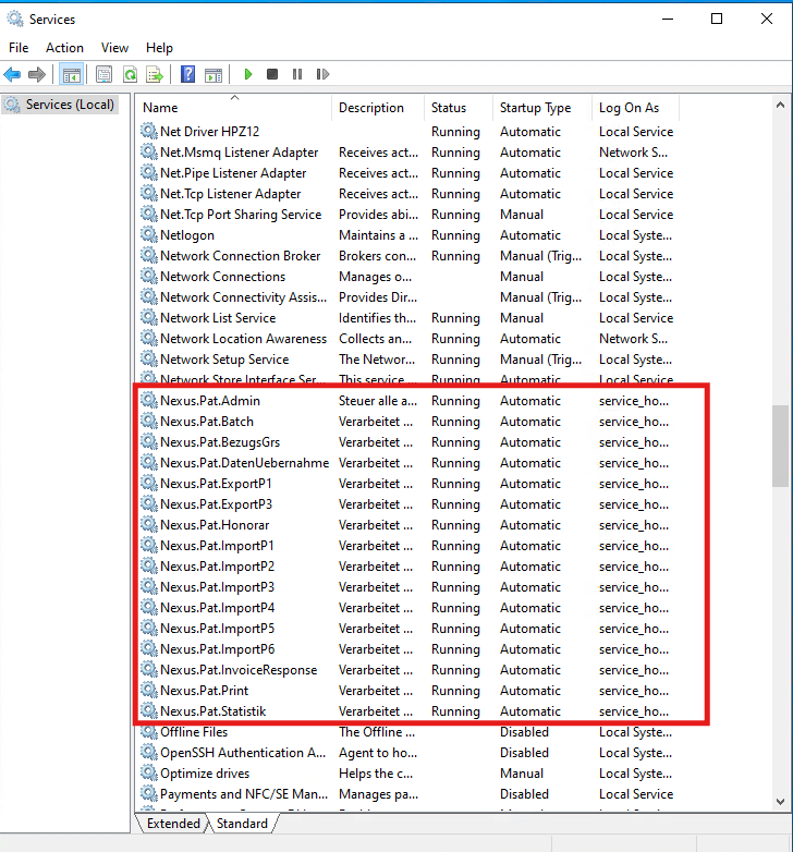 - Nexus.Pat.Batch: Ist für die Verarbeitung von Batchjobinstanzen, welche über die Applikation angelegt werden, zuständig. Bspw. für KoGus, Sammelrechnungen, LeistungsExportXML, etc.