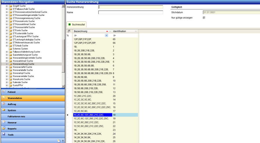 Für den oben angezeigten Beispielarzt mit seinen aktuellen Honorardaten, wurde also eine Honorarordnung mit der Bezeichnung „1C,2C,6C,12C,20C,21C,22C," angelegt.