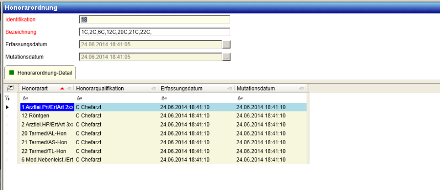 Theoretisch könnte man für jeden Arzt eine eigene Honorarordnung definieren, das ist in der Regel aber nicht notwendig. Allerding reicht es normalerweise leider auch nicht aus, pro Honorarqualifikation genau eine Honorarordnung anzulegen (also Honorarordnung «Chefarzt», Honorarordnung «Leitender Arzt», Honorarordnung «Belegarzt»,…).