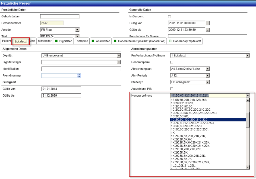 Nur natürliche Personen, die in den Stammdaten als Spitalarzt definiert sind, können überhaupt ein Honorar erhalten. Jedem Arzt, der ein Honorar erhalten kann bzw. der als Honorararzt in einer erbrachten, honorarberechtigten Leistung erfasst werden soll, muss eine Honorarordnung zugewiesen werden. Die Zuordnung zur Honorarordnung kann sich zeitlich ändern. Relevant für die Honorarparametrierung ist die Zuordnung zum Zeitpunkt der Leistungserbringung