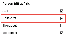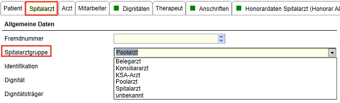 Ein Spitalarzt kann einer Spitalarztgruppe zugeordnet werden, die ebenfalls bei der Parametrierung ausgewertet werden kann (z.B. zur Unterscheidung von Spitalärzten, Beleg- und Konsiliarärzten).