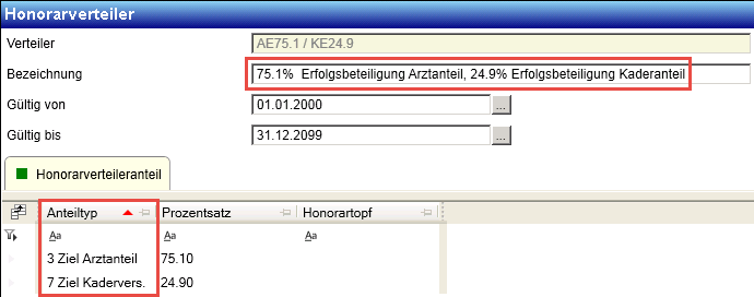 Honorar kann nach verschiedenen Anteilstypen aufgeteilt werden (Arztanteil, Fondsanteil, Kaderanteil, Verwaltungsanteil, Erfolgsbeteiligung Arzt, etc.)