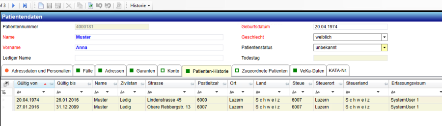 Die Patienten-Historie ist ein reines Informationsgrid. Das heisst, dass auf diesem Reiter keine Informationen erfasst werden, sondern lediglich angezeigt. Der Reiter gibt Auskunft über Adressänderungen, Zivilstandsänderungen, etc.