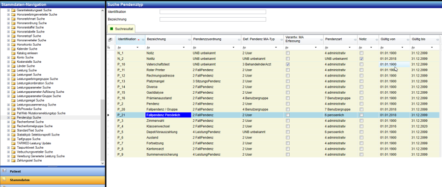 In der Stammdatentabelle ‚Pendenztyp' werden die verschiedenen Typen von Pendenzen oder Notizen, die in der Applikation erfasst werden können, verwaltet.