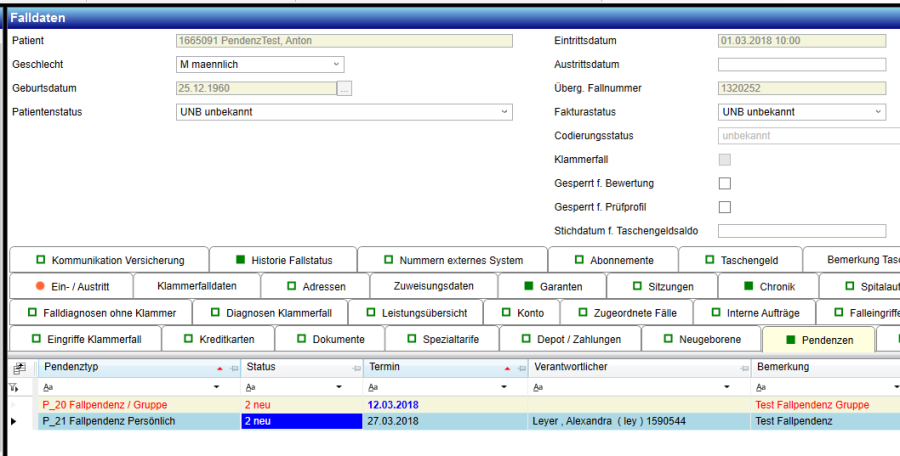 Die Pendenzen werden im Reiter ‚Pendenzen' der jeweiligen Entität angezeigt, sofern der eingeloggte Benutzer als verantwortlicher Mitarbeiter in der Pendenz eingetragen ist oder der Benutzergruppe zugeordnet ist, die als verantwortliche Benutzergruppe in der Pendenz hinterlegt ist.