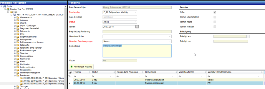 Falls bei mindestens einer Pendenz, die dem Objekt zugeordnet wurde, in den Stammdaten die Pendenzdarstellung ‚ReiterAnzeigen' definiert wurde, dann wird der Reiter mit den Pendenzen im Vordergrund angezeigt.