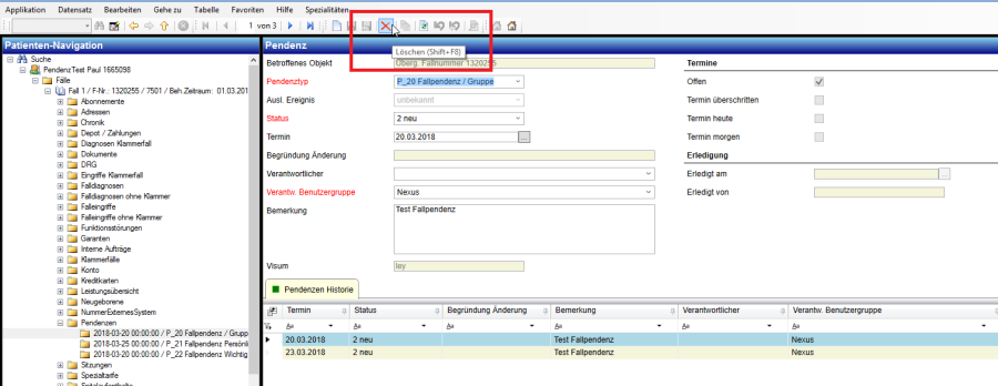 Gespeicherte Pendenzen werden über den Button ‚Löschen' nicht physisch gelöscht,