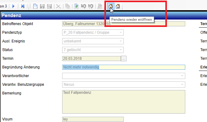Mithilfe des Buttons ‚Pendenz wieder eröffnen' kann eine bereits gelöschte Pendenz (Pendenz mit Status ‚gelöscht') wiedereröffnet werden.