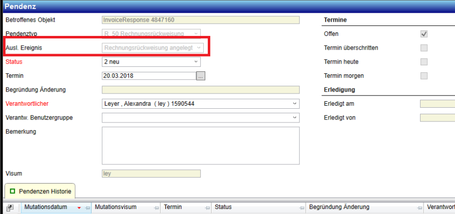 Über die Entscheidungstabelle ‚EreignisgesteuerteAktionen' kann hieraus anhand der Aktion ‚RG-Rückweisung Pendenz anlegen' eine Pendenz auf dieser Rechnungsrückweisung generiert werden.