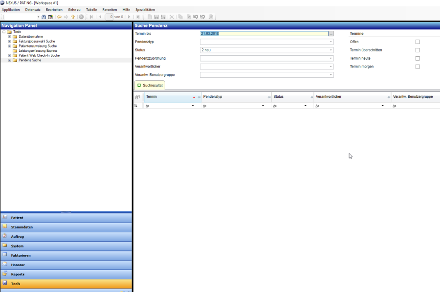 Unter dem Hauptmenü ‚Tools' wurde das Menü ‚Pendenz Suche' ergänzt, über das, Pendenzen gesucht und angezeigt werden können.