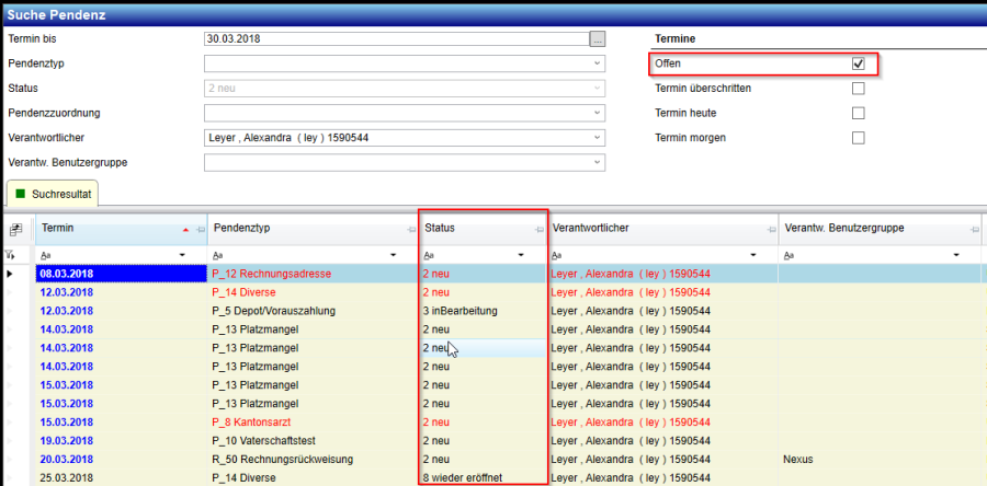 Für die Suche wird das aktuelle Datum als ‚Termin bis' vorgeschlagen und der Pendenzstatus ‚neu'.