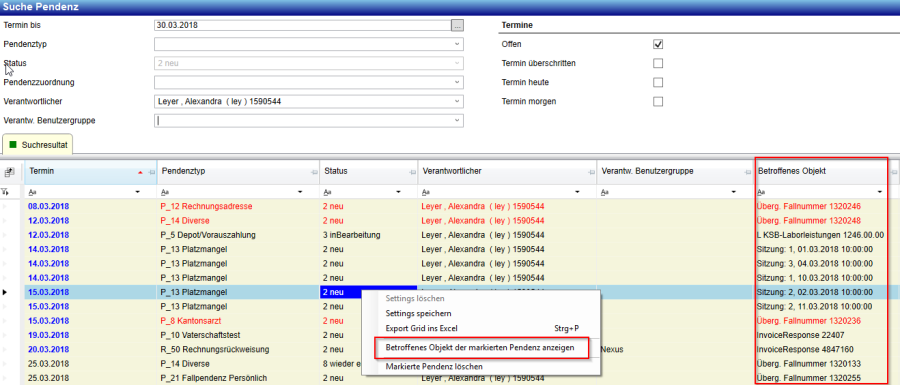 Welcher Entität die Pendenz zugeordnet ist, wird in der Spalte ‚Betroffenes Objekt' angezeigt.