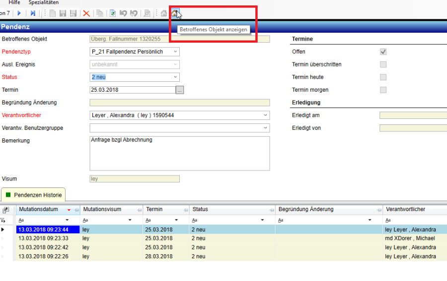 312 Betroffenes Objekt einer Pendenz anzeigen aus Detailmaske der Pendenz
