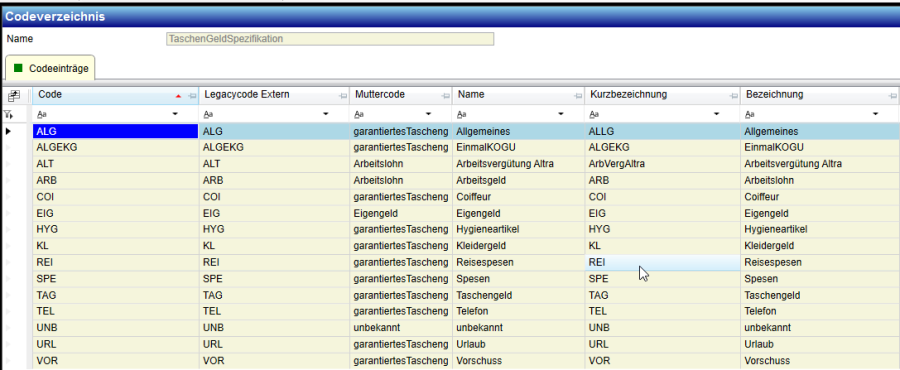 Sämtliche benötigte Taschengeldspezifikationen, die sowohl in der Taschengeldbewegung als auch bei der Taschengeldgarantie hinterlegt werden können, müssen im Codeverzeichnis ‚Taschengeldspezifikation' hinterlegt sein.