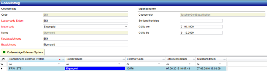 Für die Steuerung der Verbuchung wird beim jeweiligen Codeeintrag der Taschengeldspezifikation unter dem Reiter ‚Codeeinträge externes System' das Konto hinterlegt, auf welches das Taschengeld verbucht werden soll.