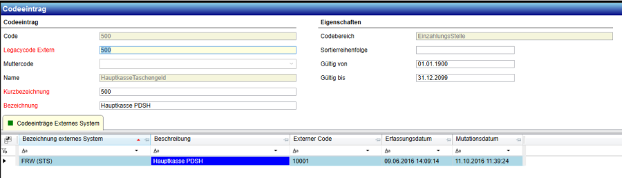 Für jede Einzahlungsstelle kann unter dem Reiter ‚Codeeinträge externes System' das Konto hinterlegt werden, auf welches gebucht werden soll.