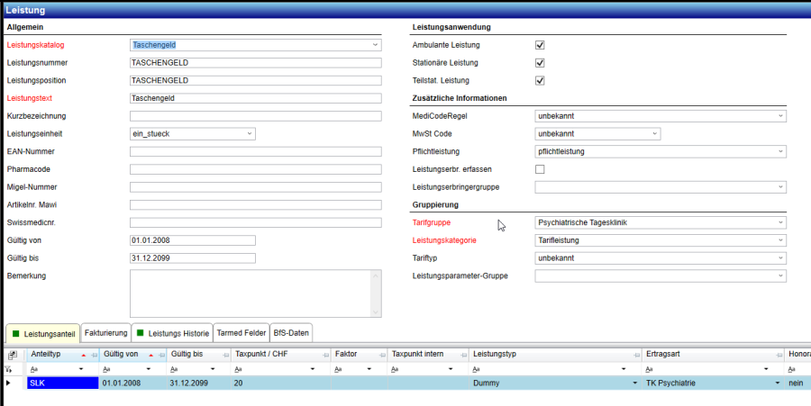Für jede Taschengeldspezifikation, die als garantiertes Taschengeld definiert ist sowie für Eigengeld und Arbeitslohn, kann in der Leistungserfassung eine Leistung für die Abrechnung generiert werden und daher muss im Leistungskatalog (Stammdaten) eine Leistung definiert sein.