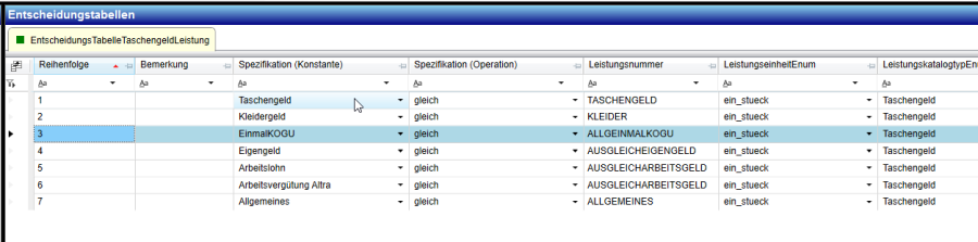 Die Zuordnung, welche Leistung aus welcher garantierten Taschengeldspezifikation heraus generiert werden soll, erfolgt über die Entscheidungstabelle TaschengeldLeistung.