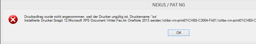 Druckauftrag wurde nicht angenommmen, weil der Drucker ungültig ist. Druckername: '\yyy'