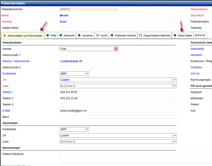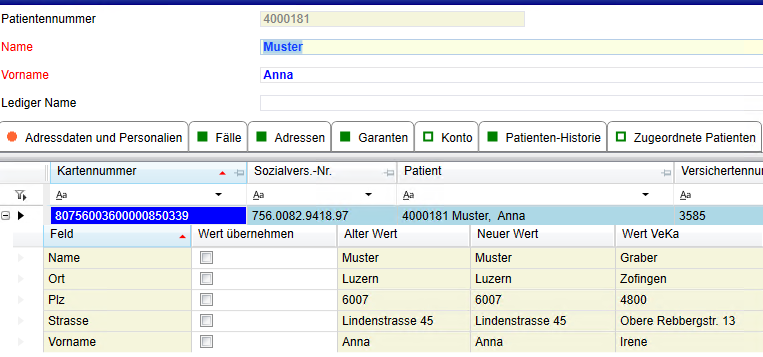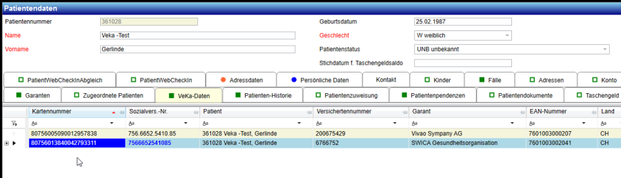 Stimmen die Daten auf der Versichertenkarte und den existierenden Stammdaten nicht überein, erscheint anschliessend automatisch der Reiter VeKa-Daten.