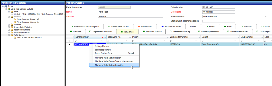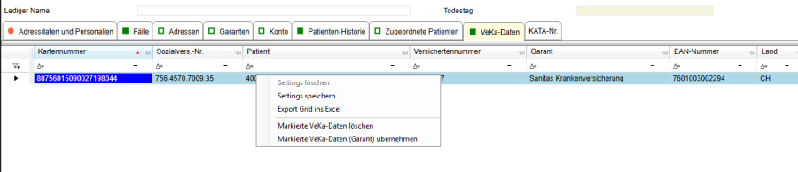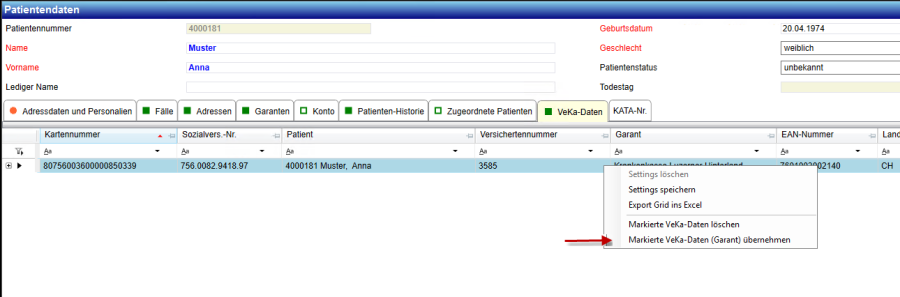 Der VeKa-Eintrag kann für den Garanten übernommen werden, mittels rechter Maustaste Markierte VeKa-Daten (Garant) übernehmen.