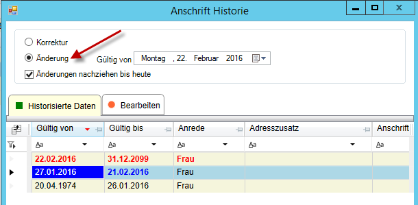 Erscheint das Fenster Historie, die Änderungen immer mit „Änderung" speichern, damit der Datensatz / die Adresse nicht überschrieben, sondern historisiert wird. Nur so können Änderungen aus der VeKa-Karte komplett nachvollzogen werden.