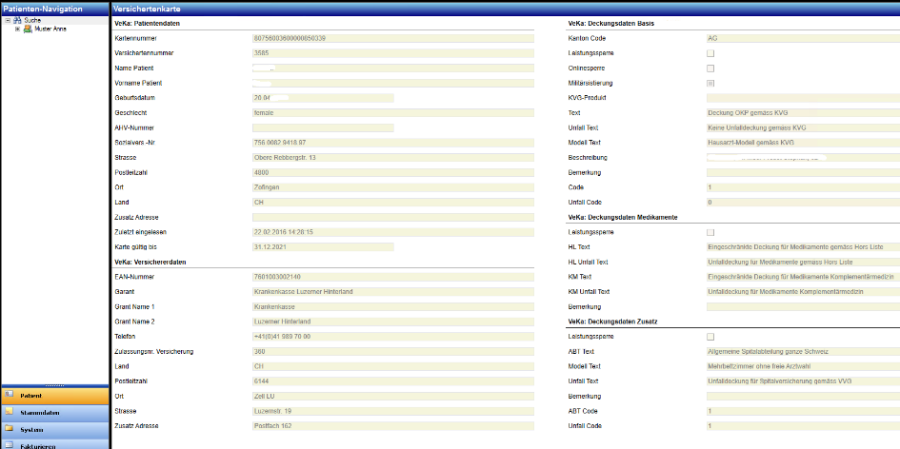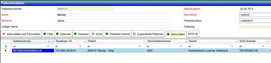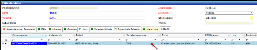 Mit Doppelklick auf den Datensatz bei VeKa-Daten werden die Kartendaten angezeigt (Versicherungsdeckung / Patientendaten / Daten des Versicherers).