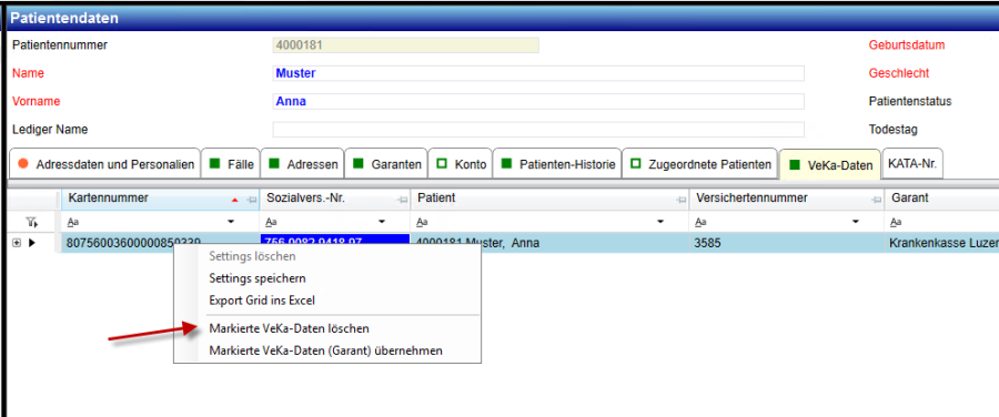 Falls versehentlich eine Zuordnung einer Versichertenkarte bei einem Patienten gemacht wurde, dann kann diese gelöscht werden. Klick mit rechter Maustaste und Markierte VeKa-Daten löschen wählen.