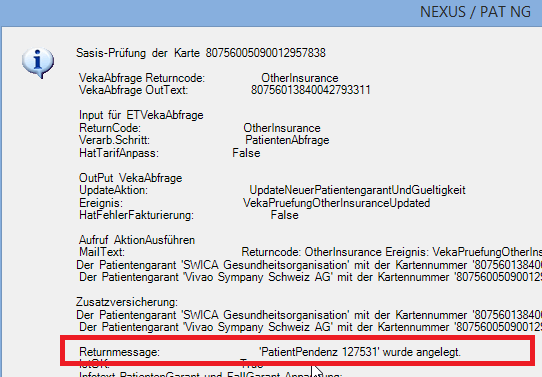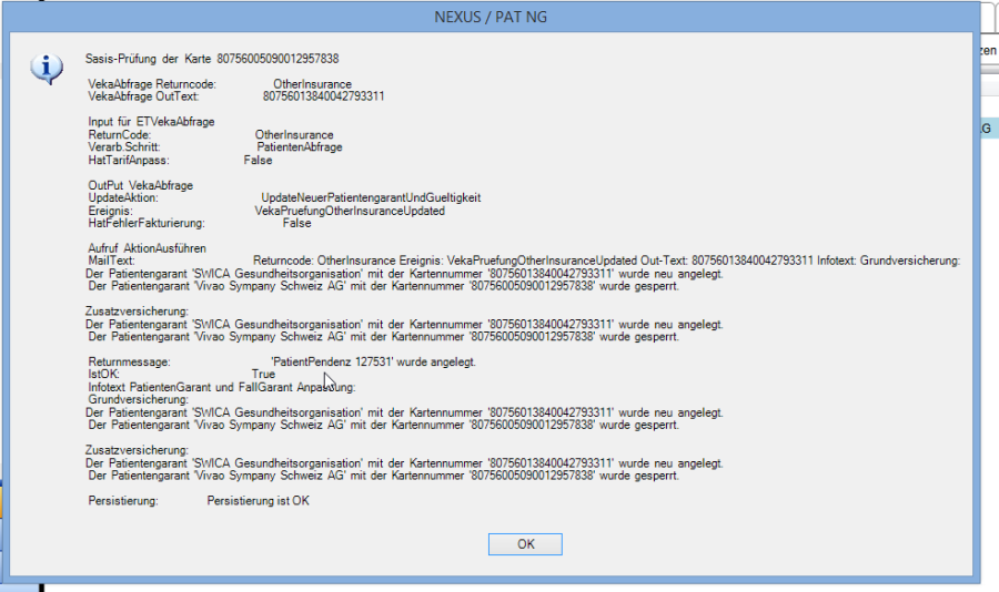 Aktuell werden im Meldungsfenster, das nach der Rückmeldung von SASIS geöffnet wird, all diese Informationen angezeigt. Dieses Meldungsfenster wird noch angepasst und übersichtlicher gestaltet.