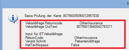 In diesem Beispiel wurde der Returncode 16 'Die mitgelieferte Kartenummer ist nicht mehr aktiv, es wurde eine aktive Kartennummer innerhalb eines anderen Versicherers gefunden' ('Other Insurance') zurückgemeldet.