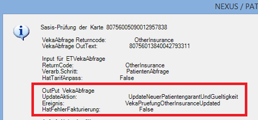 Wird beim Einlesen einer VeKa-Karte über SASIS festgestellt, dass die eingelesene VeKa nicht mehr gültig ist, es aber eine neue Kartennummer gibt, entweder bei derselben Versicherung oder bei einer anderen Versicherung, dann wird diese neue VeKa eingelesen und übernommen.