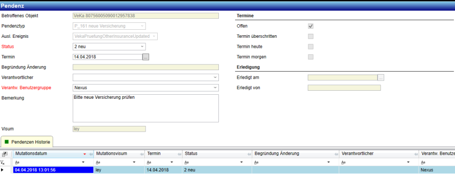 Zu diesem Ereignis wurde in der Entscheidungstabelle 'Aktion ereignisgesteuert' definiert, dass eine Pendenz auf Patientenebene generiert wird.