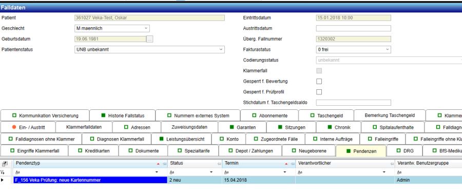 Für die beiden Fälle 1020300 und 1320302 meldet die Veka-Abfrage einen Fehler, so dass die beiden Fälle aus dem Fakturajob gelöscht wurden und auf der Fehlerliste erscheinen. Gleichzeitig werden die in der Entscheidungstabelle 'VekaAbfrage' definierten Ereignisse generiert und über die Entscheidungstabelle 'Aktion ereignisgesteuert' Pendenzen auf Patienten- und Fallebene angelegt: