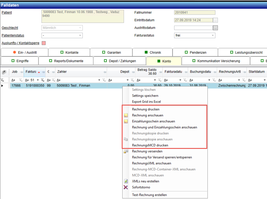 Dazu geht man über die Fallmaske in das Register «Kontobewegung», wählt die gewünschte Rechnung aus, und wählt anschliessend über einen Rechtsklick im Kontextmenü die gewünschte Funktion: