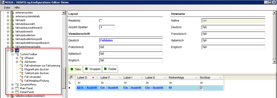 Abbildung 4.6: Darstellung des Konfigurationseditors und der verfügbaren Reiter im Detail Panel einer Maske, hier beispielhaft auf Fallebene.