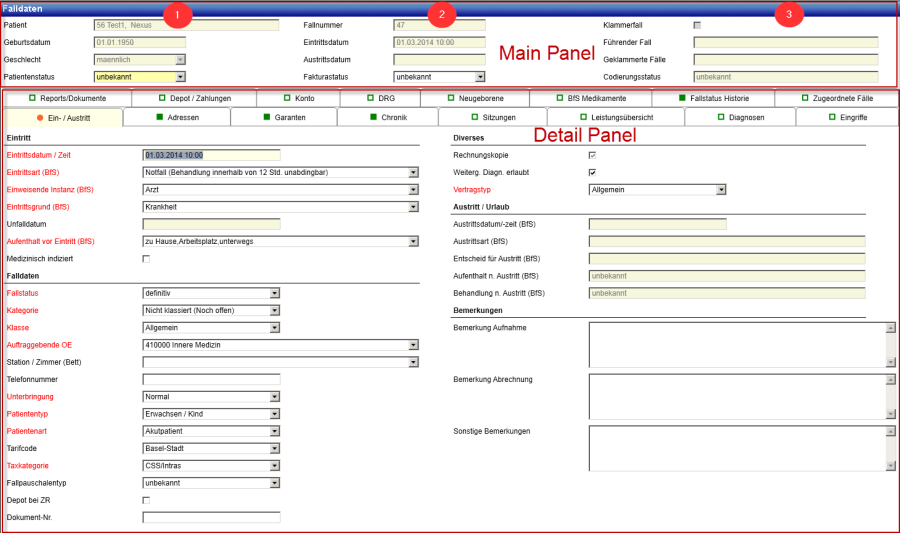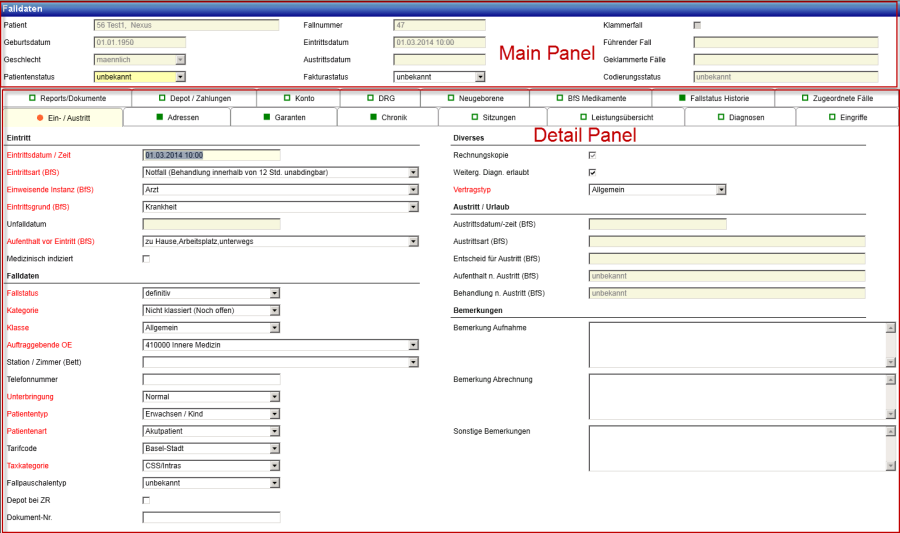 Abbildung 4.3: Unterteilung der Maske in das Main Panel und das Detail Panel, hier beispielhaft auf Fallebene dargestellt.