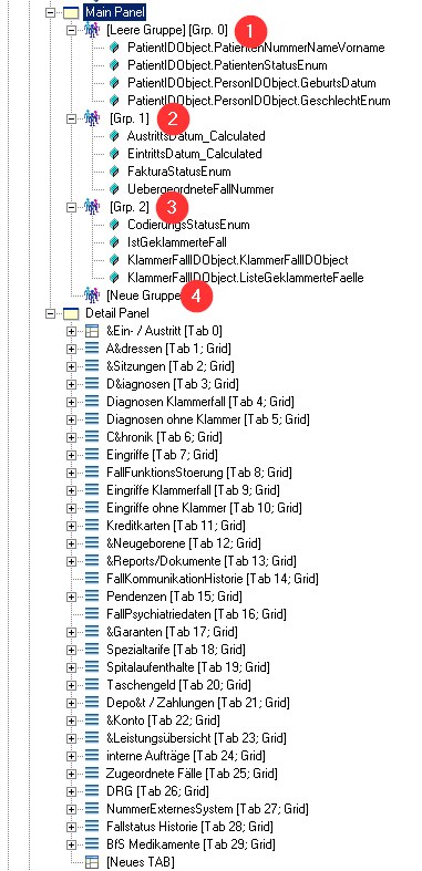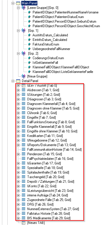 Der Menüpunkt Detail Panel unterteilt sich im Konfigurationseditor zuerst in die verschiedenen Tabs bzw. Reiter der Maske (siehe Abbildung 4.6), unter welchen sich ebenso Gruppierungen vornehmen lassen.