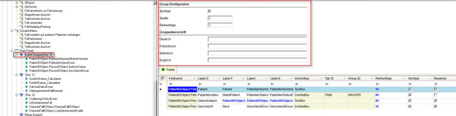 Abbildung 4.7: Details einer Gruppe im Konfigurationseditor, über die die Benennung und Anordnung der Gruppe gesteuert werden können.