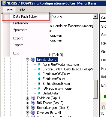 Soll einer Gruppe ein neues Feld hinzugefügt werden, welches bisher nicht in der Navigation des Konfigurationseditors aufgelistet ist, so kann dieses über den Menüpunkt «Datei – Data Path Editor» hinzugefügt werden.