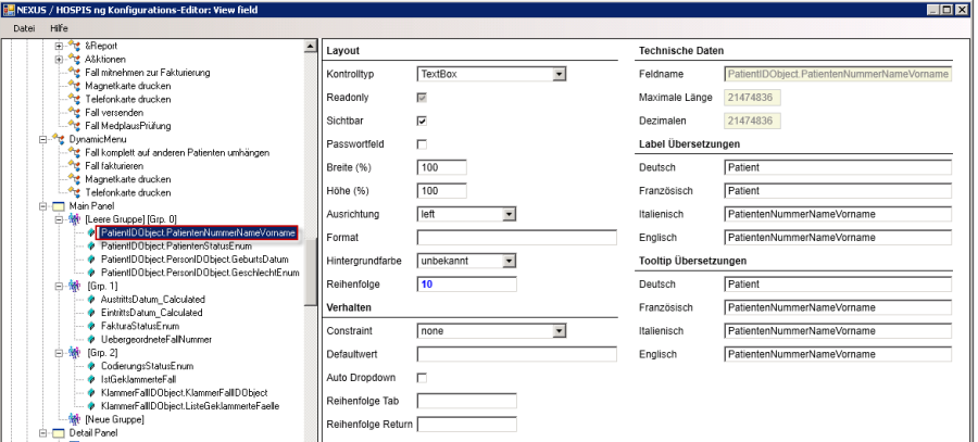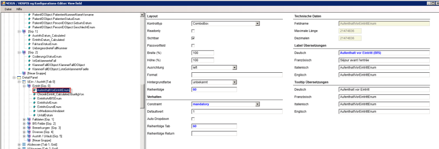 Wird in der Navigation des Konfigurationseditors das Datenfeld selbst angewählt, so können im sich öffnenden Panel weitere Eigenschaften des Feldes bestimmt werden. Beispielsweise Festlegung von Layout, Verhalten, Benennung und Beschreibung sowie deren Übersetzungen (siehe Abbildung 4.10).