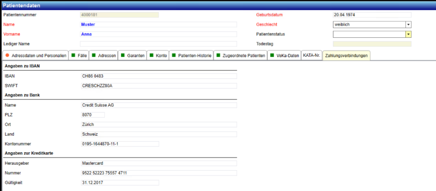 NEXUS / PAT NEXUS / PAT NG - Handbücher Basishandbuch Current: Zahlungsverbindungen PDF Download PDF Download page Zahlungsverbindungen. Current page All pages Zahlungsverbindungen Auf dem Reiter Zahlungsverbindungen können die Bankdaten und die Kreditkartendaten eines Patienten erfasst werden. Abbildung 350 Feld Beschreibung IBAN SWIFT Name Name der Bank PLZ Ort Land Kontonummer Herausgeber Herausgeber der Kreditkarte Nummer Kreditkartennummer auf der Vorderseite Gültigkeit Gültigkeitsdatum als Datum erfassen. Abbildung 351 ×