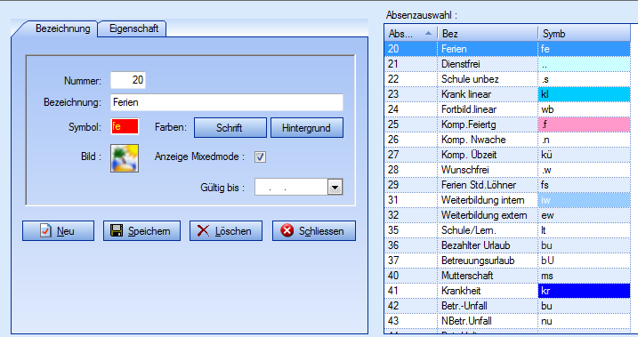 Die Absenz besteht aus einer Bezeichnung, einem 2'stelligen Absenz –Symbol, Hintergrund- und Schriftfarben, Ikone und der Absenz - Dauer.