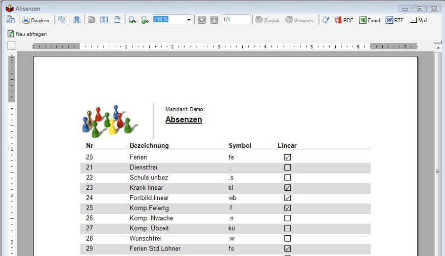 Mit den Schaltflächen „PDF, Excel, RTF und Mail" rechts oben können Sie zudem die Liste in das erwähnte Programm exportieren.