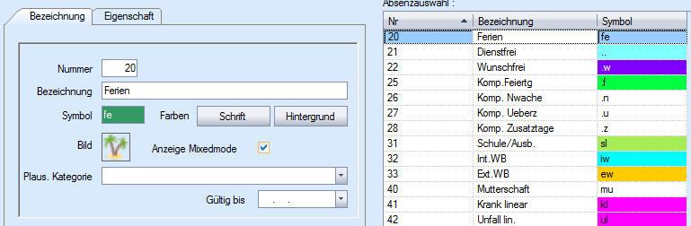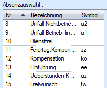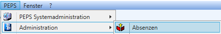 In der Menüleiste unter PEPS / Administration / Absenzen oder Abwesenheiten finden Sie alle Symbole, welche als Absenzen /Abwesenheiten erfasst wurden und für das ganze Haus gültig sind.