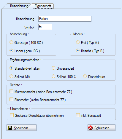 Alle Absenzen /Abwesenheiten mit gesetztem Schalter verhalten sich prozentual zur Beschäftigung. Alle Absenzen ohne Schalter berechnen jeweils 100% Sollzeit.