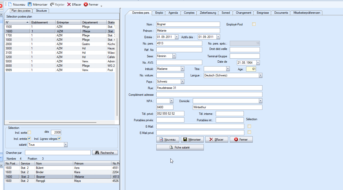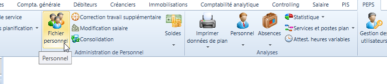 Dans la barre de menu, sous « PEPS »_ « Administration du personnel »_ « Fiche du personnel », vous accédez à la fiche du personnel. Vous pouvez également ouvrir la fiche du personnel en double-cliquant directement sur le nom dans le tableau de planification.