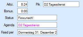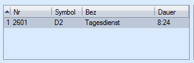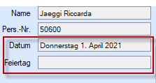 Dieser Teil der Plantafel beschreibt einen Planungstag eines Mitarbeiters. Die Anzeige gilt für denjenigen Tag und Mitarbeiter auf welchem gerade der Cursor steht. Den Wochentag und das Datum, ob es sich um einen Feiertag handelt, sehen Sie im Datums- bzw. Feiertagsfeld.